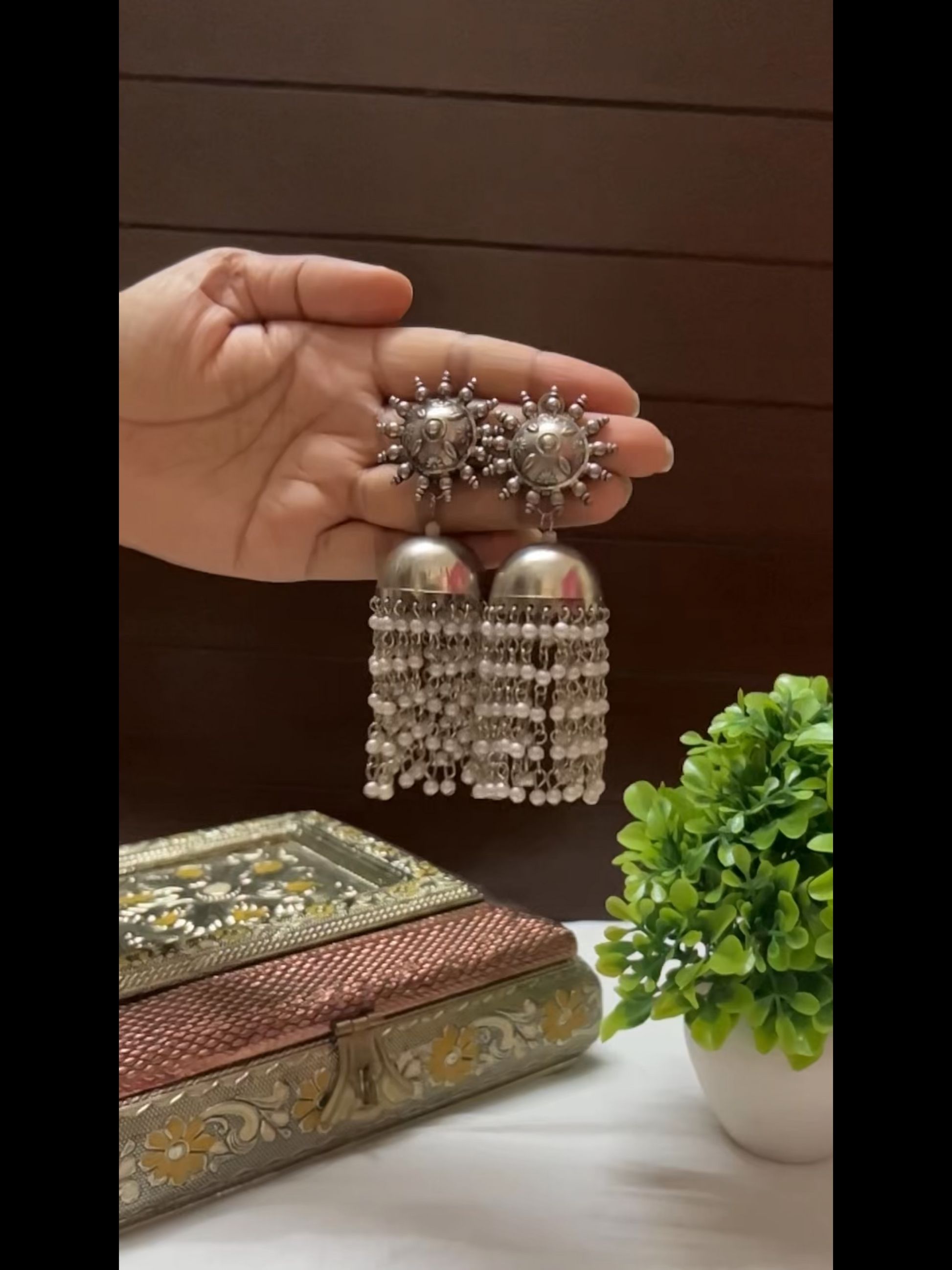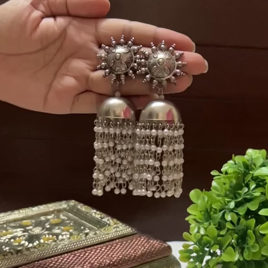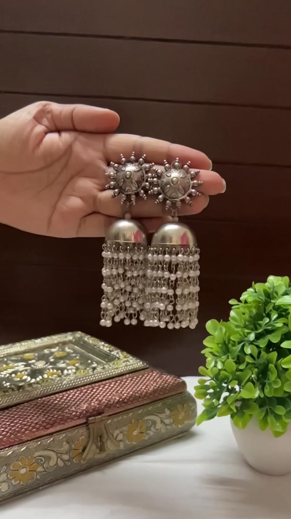 Make a powerful style statement with these stunning Oxidised Silver Tassel Earrings, crafted to give your look a bold, boho-chic edge. The earrings feature an intricately carved sunburst stud top, adding a vintage tribal charm. Attached below is a smooth oxidised dome that flows into long, cascading crystal-bead tassels, giving the piece dramatic movement and shine.
