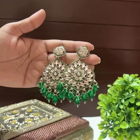 These stunning Oxidised Kundan Chandbali Earrings blend traditional charm with a rich antique finish. The intricate design features layered kundan work arranged in floral and geometric patterns, giving the earrings a beautiful handcrafted appeal. The oxidised silver tone adds a vintage touch, while the bottom is finished with emerald green bead droplets that enhance movement and richness.