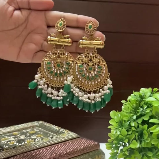 These exquisite Handcrafted Kundan Chandbali Earrings are designed to elevate your traditional look with a rich blend of color and craftsmanship. The intricate gold-toned base is adorned with sparkling Kundan stones arranged in an ornate circular pattern. The lower edge features deep emerald green bead drops, beautifully complemented by a dual layer of micro pearls, adding texture and elegance.